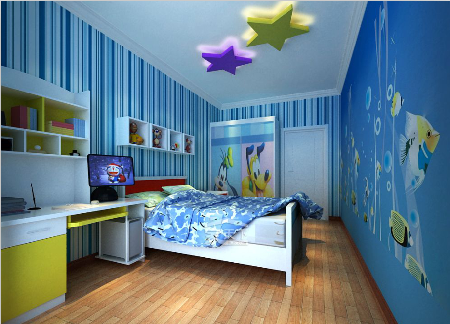 2、空间,男孩子都好动,房间内要有足够的空间给他们进行玩耍,所以不要布置太多家具,床等都尽量靠边放。